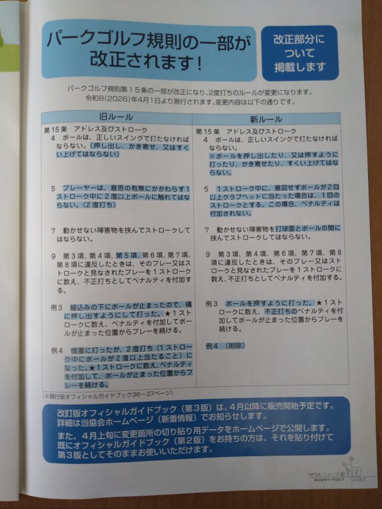 パークゴルフ規則第15条の一部が改正されることになり、2度打ちのルールが変更されます。